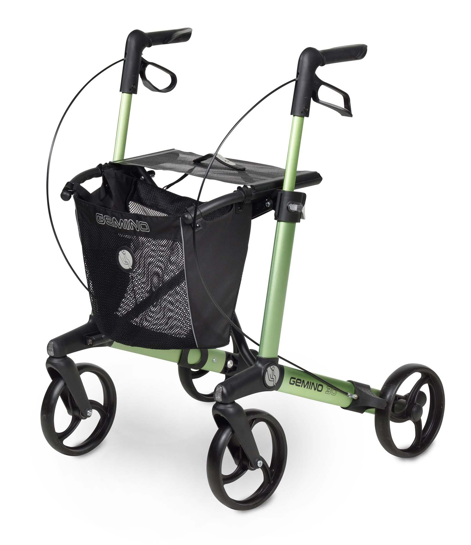 Ein Leichtgewichtrollator Gemino 30/30M mit Einkaufsnetz und TPE-Rädern.