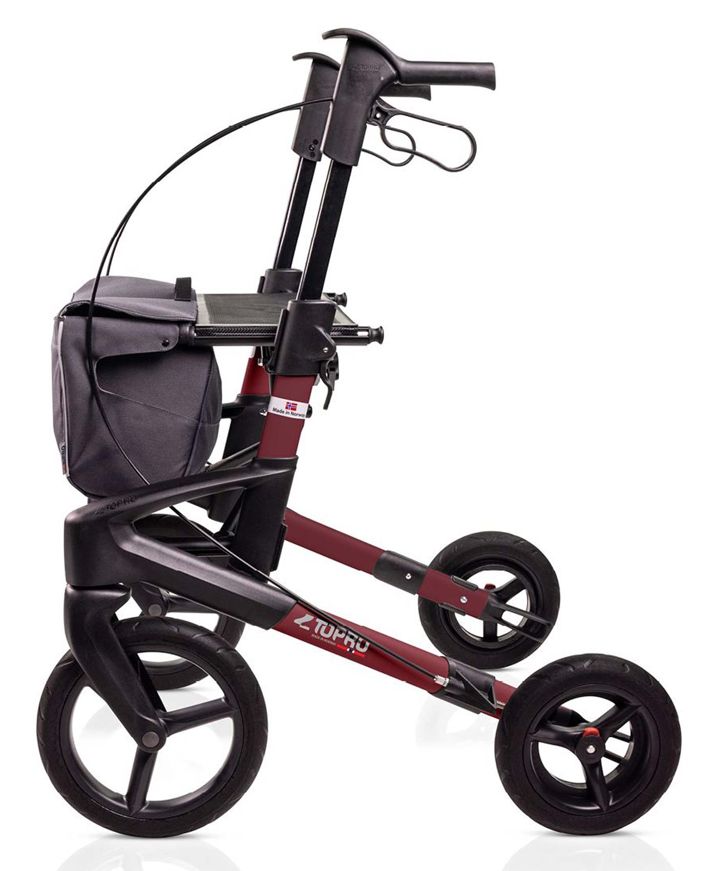 Die kleineren Hinterräder mit dem integrierten Bremssystem IBS lassen sich mit den Quick Release einfach werkzeugfrei abnehmen. Optional bietet Topro Räder mit verschiedenen Profilen für unterschiedliche Untergründe zum Nachkauf an.