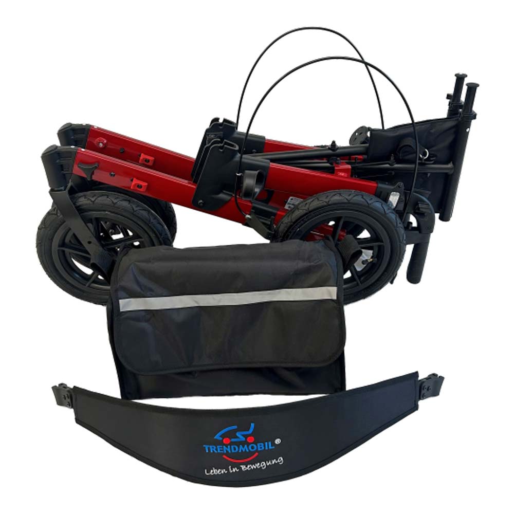 - Ein doppelt faltbarer Trendmobil Outdoor Rollator Ektos in anthrazit oder weinrot inklusive mit Rückengurt, Stockhalter, Einkaufstasche, Getränkehalter