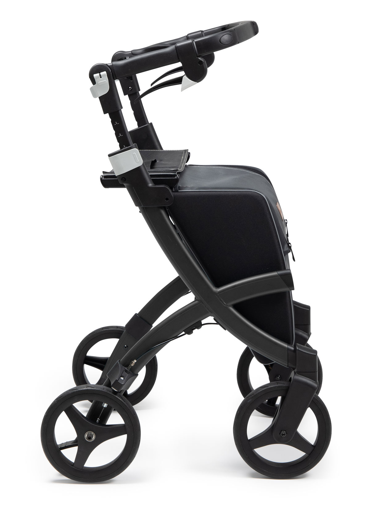 - Der ergonomische Handgriff ist höhenverstellbar und unterstützt das aufrechte und sichere Gehen