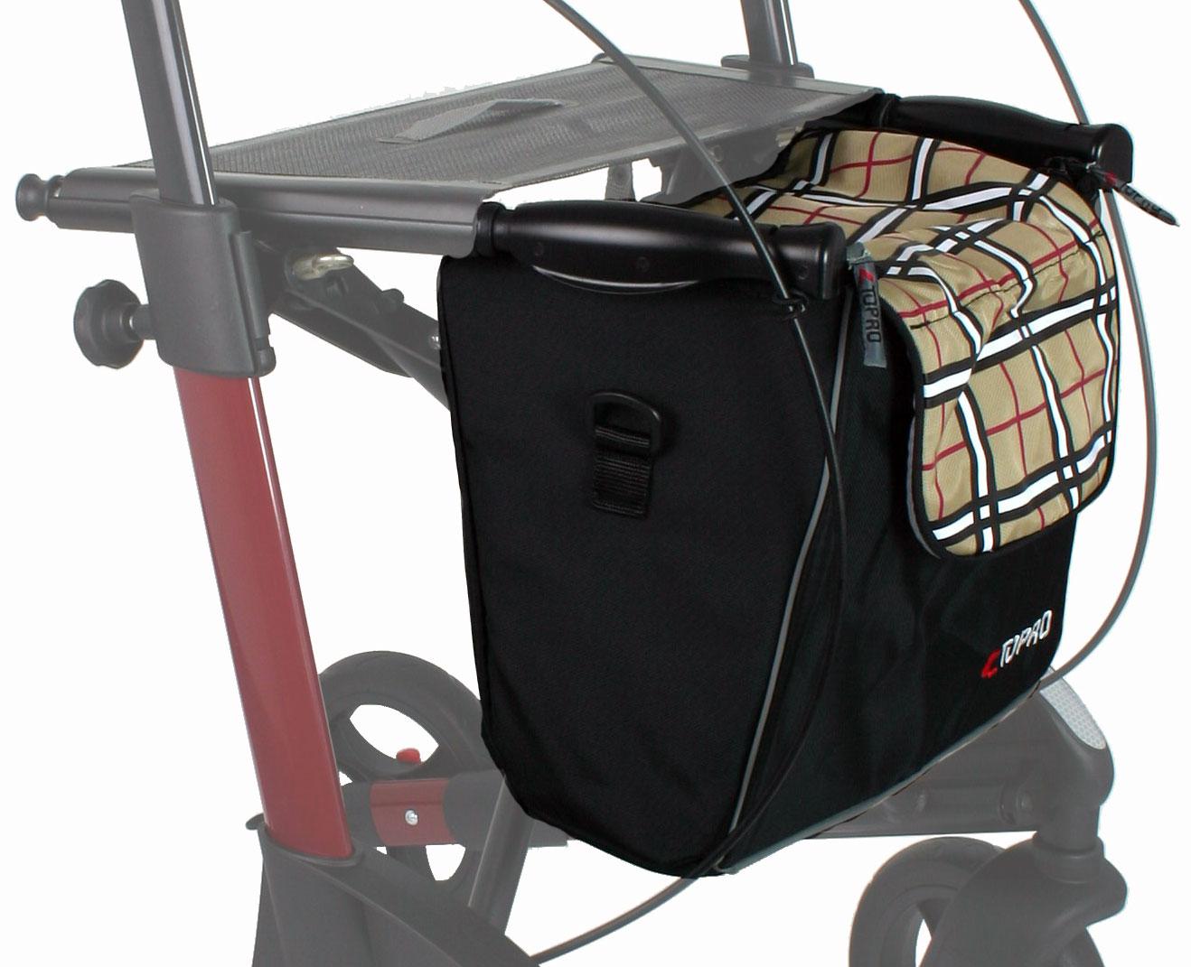 Die Einkaufstasche ist für Sie einfach und sicher auf die Befestigungsstangen zu stecken. Sie ist geräumig und gleich mit einer Halterung für Getränke und 2 Ablauflöchern ausgestattet. Die Belastbarkeit bis 10 kg wird durch die stabilen Befestigungsbügel, die auf die Befestigungsstangen gesteckt werden, gewährleistet. Ausgestattet mit einem Tragegurt und Reißverschluss können Sie Ihre Utensilien sicher verstauen und bei Bedarf die Tasche vom Rollator entfernen und sich über die Schulter hängen. Das Extra Umpacken beim Transport des Rollators kann so entfallen.