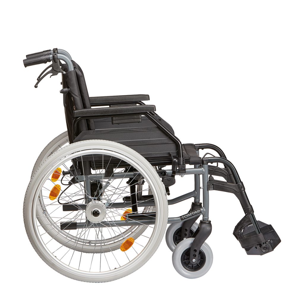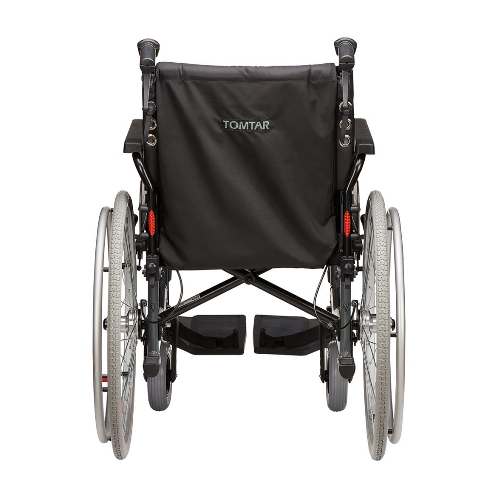 Als faltbarer Leichtgewichtrollstuhl TOMTAR MR-LG aus dem Sanitätshaus verfügt er über 24 Zoll (ca. 61 cm) große Antriebsräder mit pannensicherer PU-Bereifung und Steckachse. So können die großen Räder jederzeit ohne Werkzeug abgenommen und wieder an den Faltrollstuhl angesteckt werden. Dies ist vor allem beim Verladen und Transport des leichten Rollstuhls im Kofferraum des Autos hilfreich. Seine vorderen Lenkräder sind ebenfalls pannensicher und haben einen Durchmesser von 7 Zoll (ca. 18 cm).