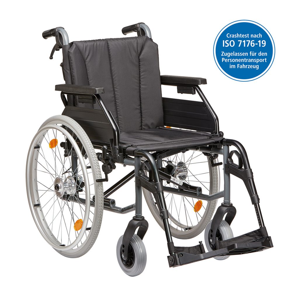 Der leichte Rollstuhl von Dietz ist Crashtest zertifiziert nach ISO 7176-19 und zugelassen für den Personentransport im Fahrzeug.