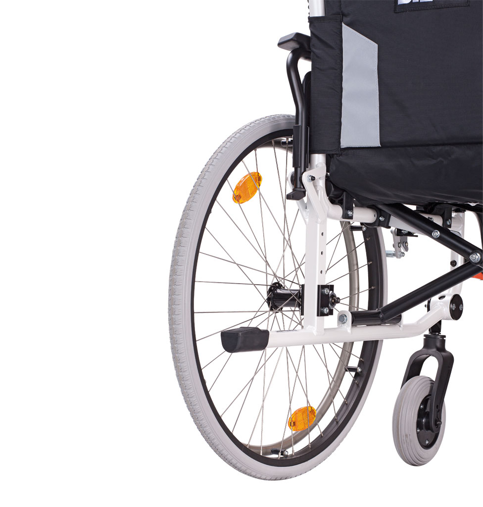 Die standardmäßig vorhandene Feststellbremse oder auch Kniehebelbremse genannt, kann auch von der im Faltrollstuhl sitzenden Person bedient werden. Die Feststellbremse verhindert das Wegrollen des Leichtgewicht-Faltrollstuhls Caneo E beim Ein- und Aussteigen. Optional können die faltbaren Rollstühle mit einer zusätzlichen Trommelbremse für die Begleitperson (TBB) geliefert werden. Über die Trommelbremsen an den Schiebegriffen kann das Tempo so dosiert und sicher durch die schiebende Person reduziert werden. Die Trommelbremse empfiehlt sich vor allem beim Einsatz auf abschüssigen Wegen, wenn der leichte Rollstuhl geschoben wird.