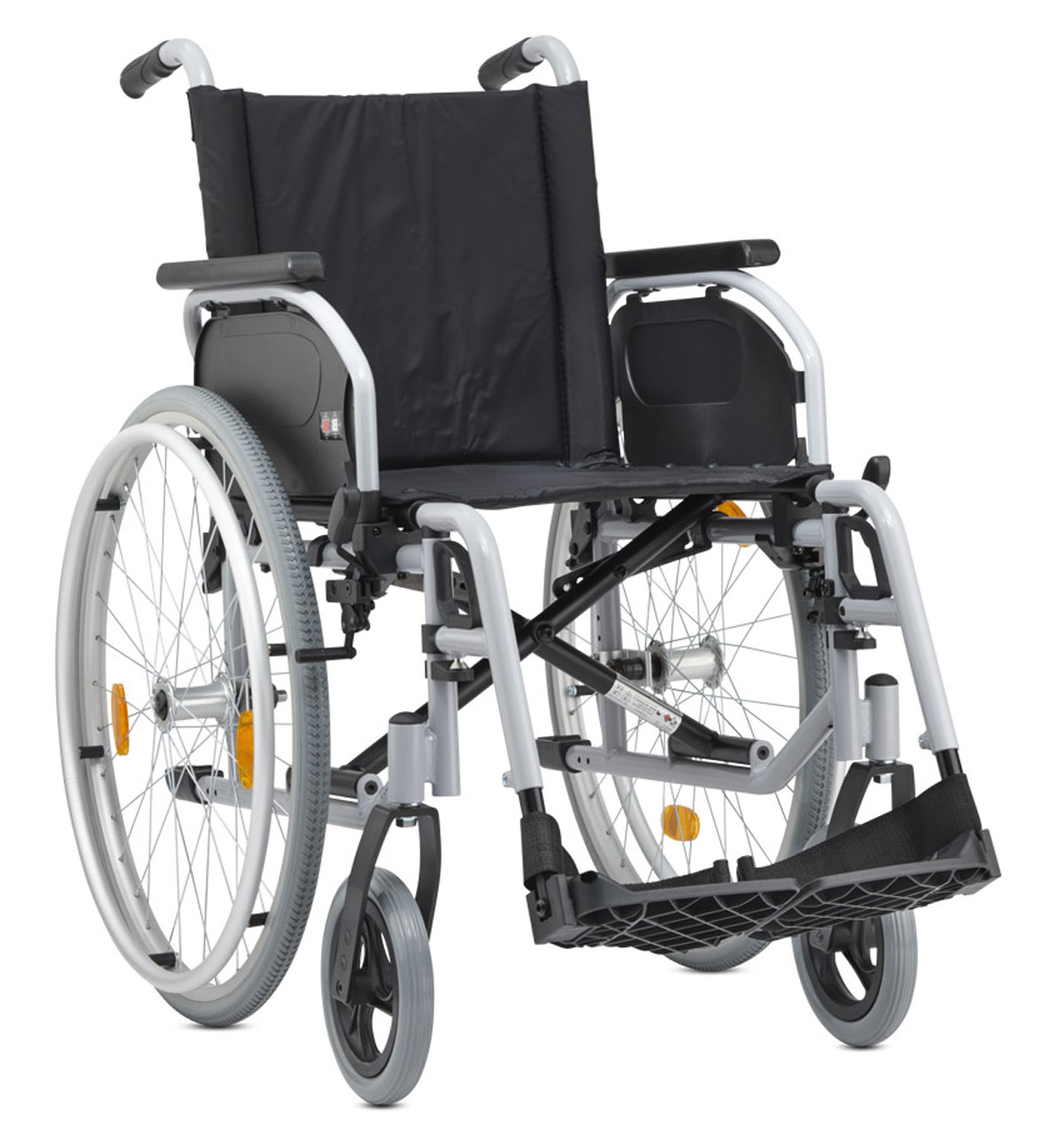 Als mobilisierendes Hilfsmittel mit pannensicherer PU-Bereifung verfügt der Rollstuhl über eine Feststellbremse und ist optional mit Trommelbremse für die Begleitperson lieferbar.