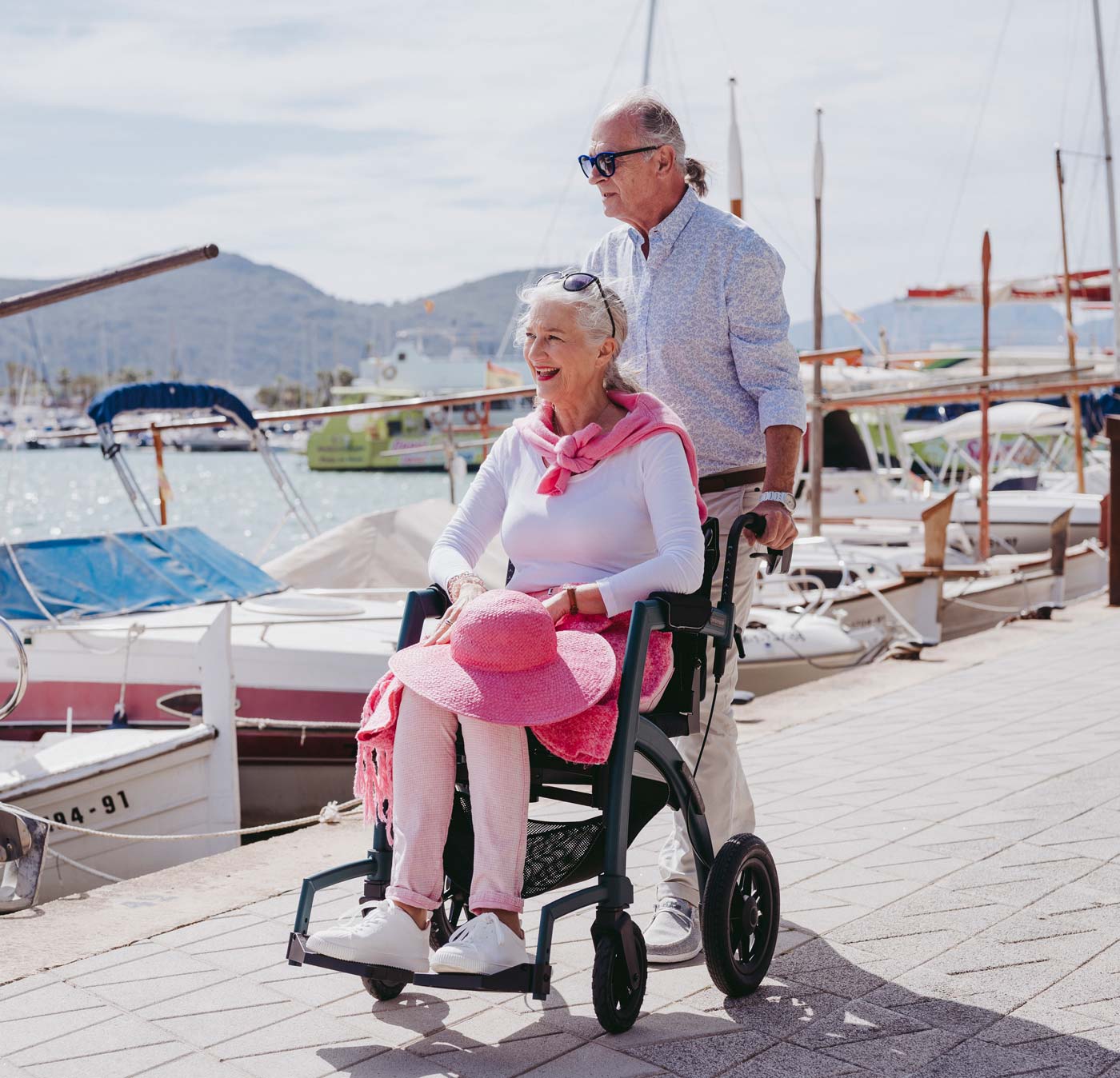 - Die großen, luftbereiften Hinterräder sind breiter und lassen Sie noch entspannter zu Fuß und bei der Nutzung als luftbereifter Transportrollstuhl auf unebenem Untergrund unterwegs sein.