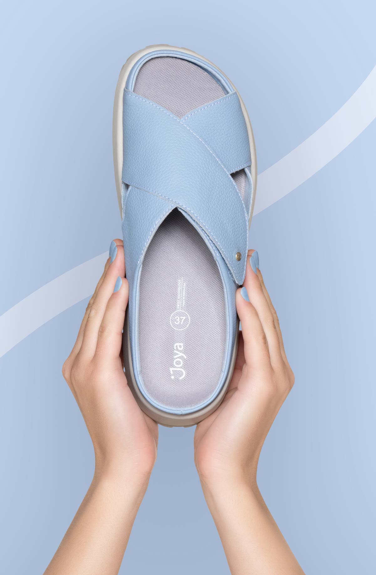 Die Senso-Sohlen Technologie der offenen Joya Alicante Light Blue Damen Schuhe sind im Fersen- und Vorfußbereich aufgrund der eingebauten Extra-Dämpfungstechnologie besonders weich. Extra gepolsterte Bereiche bieten eine optimale Linderung für diejenigen, die unter Schmerzen beim Gehen leiden. Auf harten Böden sorgen die weichen Senso-Sohlen für einen stoß absorbierenden, gedämpften Auftritt. Schon beim Einstieg in die bequemen Joya Pantoletten Alicante Light Blue fühlen Sie das Wohlfühlerlebnis am Fuß. Dies schont Ihre Gelenke und entlastet das Fußgewölbe. Ihr Rücken entspannt und Sie gehen aufrechter durch den ganzen Tag. Gerade aktive Bewegungen, ob in der Freizeit, zu Hause oder im Beruf ist körperliche Entlastung beim Gehen und Stehen besonders wichtig. Entlasten Sie Ihr Fußgewölbe, beugen Sie Vorfußschmerzen vor und gehen Sie den ganzen Tag entspannt. Die patentierte Dämpfung lindert zudem einen Fersensporn.