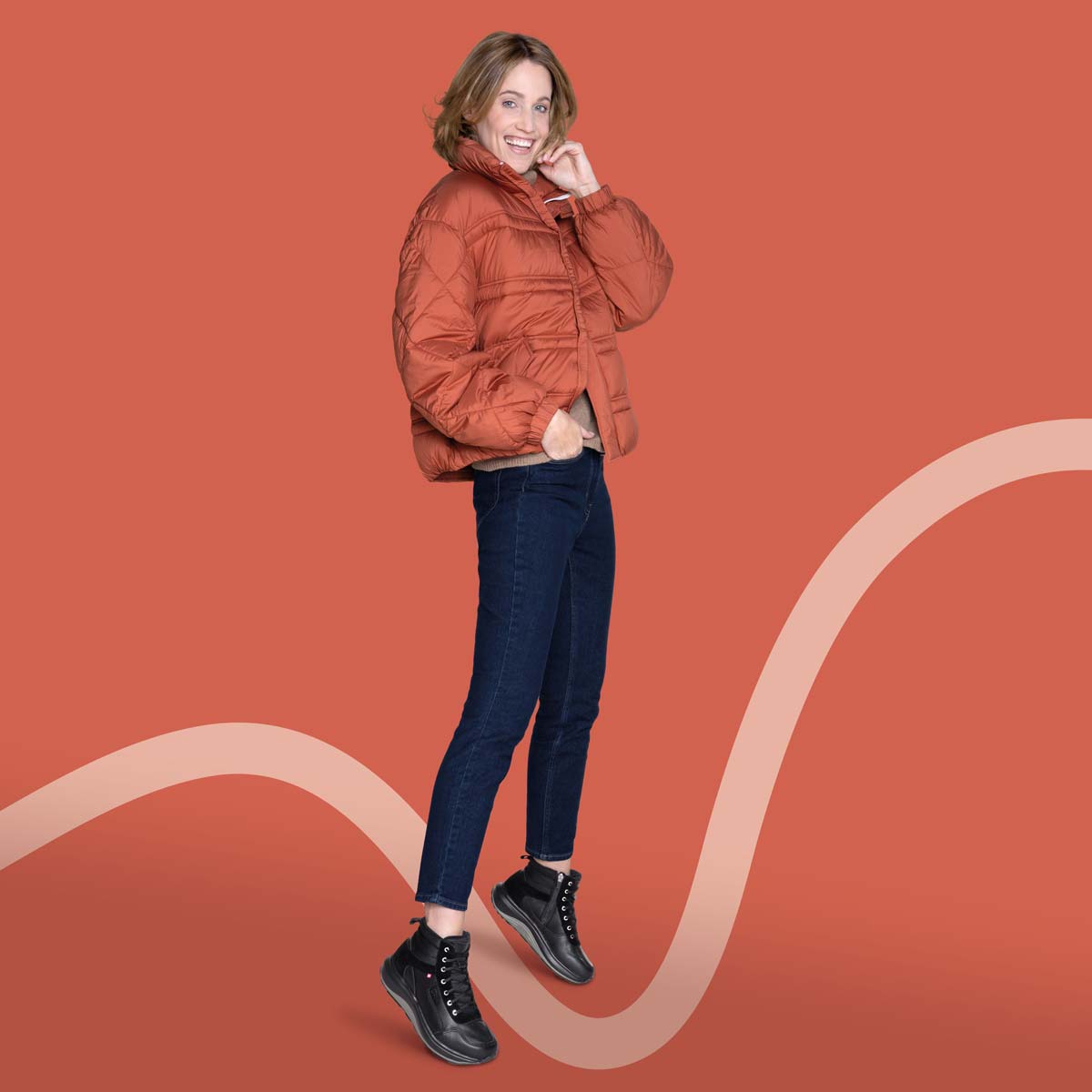 - Eine ergonomisch geformte „Welle“ zwischen dem weichen Fußbett und der Außensohle unterstützt eine leichte Abrolldynamik des Fußes und die Statik des Körpers.