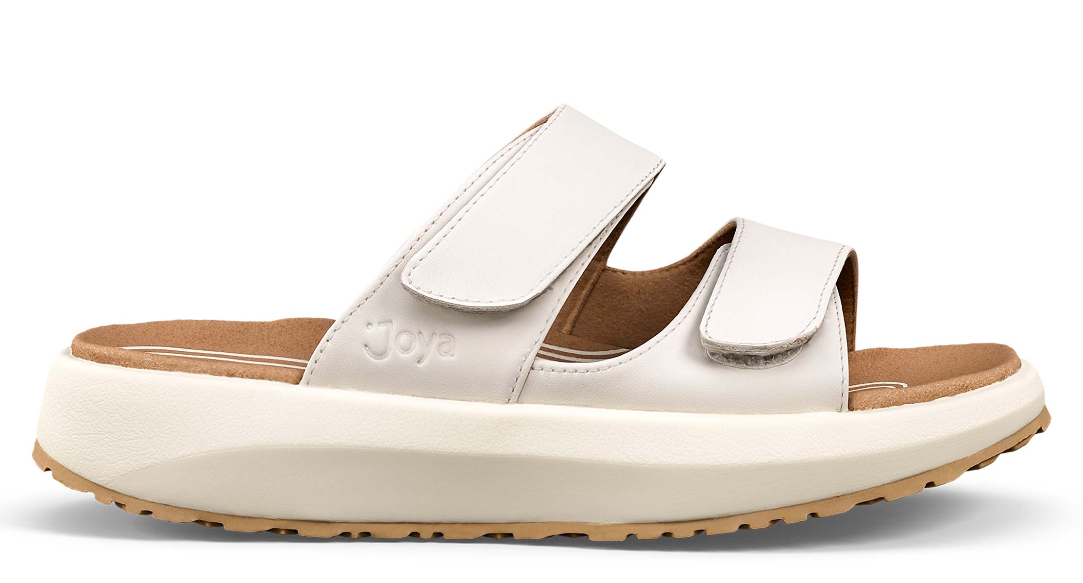 Leichte Damen Schuhe Joya Vienna III White sind bequeme Pantoletten mit verstellbaren Klettriemen für die Weite H bis K, die Sie auf elastischen Joya Senso-Sohlen mit Mittelfußstützen weich gedämpft auftreten und entspannt gehen lassen. Über 2 Klettverschlüsse können die Klettriemen individuell am Fuß angepasst werden. Weiche Joya Komfortschuhe für Ihre Gesundheit entlasten Ihren Rücken und schmerzende Füße. Joya Vienna als Hausschuhe oder draußen als leichte Pantoletten in der warmen Jahreszeit sind Ihre beste Wahl für den täglichen Komfort, wenn Sie auf harten Böden mit weich stoßabsorbierenden Schuhen Ihre Gelenke entlasten möchten.