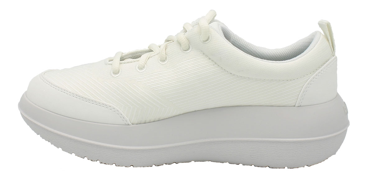 Wenn Sie die Kybun Bauma White Damen Schuhe kaufen, entscheiden Sie sich für ein Modell mit Strato Luftkissensohlen und damit einen stärkeren Trampolin-Effekt. Die Strato Sohlen sind so konzipiert, dass sie beim Gehen im Rückfußbereich optimal abrollen. Der Sohlentyp bietet maximale Wirkung, sowie grösstmöglichen Trainingserfolg und hervorragende Dämpfung beim entlastenden Gehen. Der Fußdruck wird gleichmäßig verteilt und die Kraftübertragung optimiert. Das elastisch-federnde PU-Material gleicht effektiv Ihre Schonhaltung und Schiefstellungen aus, indem es die hintere Muskelkette Ihres Körpers bei jedem Schritt dehnt, und sorgt mit seinem durchgehenden Sohlenprofil und der großen Kontaktfläche zum Boden für optimalen Halt auf jedem Untergrund.