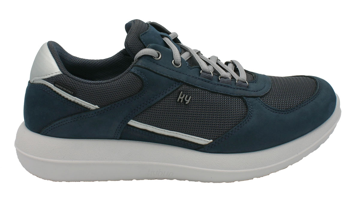 Bequeme Kybun Rolle Navy Herren Schuhe mit elastisch-federnden Kybun Tropo-Luftkissensohlen sind weiche Komfortschuhe, die Ihr Wohlbefinden mit jedem Schritt steigern. Klassisch geschnitten mit einem Obermaterial aus dunkelblauem Leder und atmungsaktivem Mesh bringen die sportlichen Gesundheitsschuhe für Männer Rolle Navy von Kybun mit verspielten Akzenten modisch gesundheitsfördernd Schuhe an Ihre Füße. Wenn Sie sich zum Kauf der Herren Komfortschuhe Kybun Rolle Navy mit der etwas flacheren Tropo Sohle für mehr Laufsicherheit entscheiden, eignen sie sich bestens für gesundheitsbewusste Herren, die auf verspielte Details nicht verzichten möchten. Silbrige Ösen und helle Schnürsenkel verleihen dem maritimen, sportlichen Design dezenten Glamour.