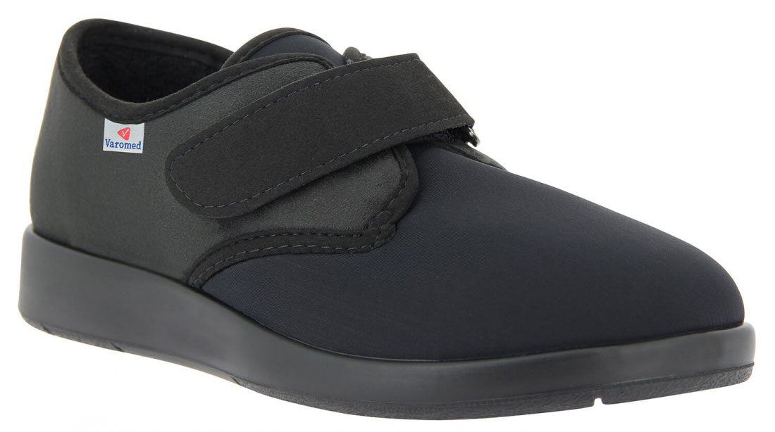 Die optimal für druckempfindliche Füße geeigneten Unisex Schuhe Varomed Tromsö schwarz in Weite L für Damen und Herren aus weichem Stretchmaterial mit variablem Klettverschluss mit Umlenkschnalle. Ihr Vorfuß findet druckfrei genügend Platz für alle Arten von Zehenfehlstellungen. Die Einlegesohle mit Lederbezug. Die bequemen Gesundheitsschuhe für stärker geschwollene Füße besitzen ein griffiges Sohlenprofil, das problemlos auch im Außenbereich getragen werden.