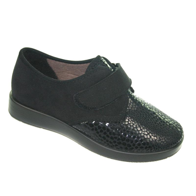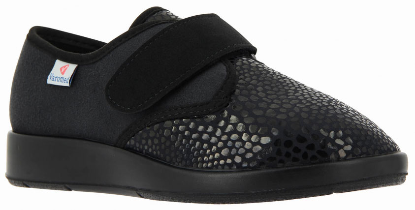 Das Material der weiten Varomed Zürich Klettschuhe wirkt durch seine Kroko-Optik sehr edel und lässt den Fuß schmaler erscheinen, ohne dass sie wie Schuhe aus Textil wirken. Der Fersenbereich der schwarzen Zürich Straßenschuhe von Varomed besteht aus pflegeleichtem Microvelours und ist mit einer stabilen Hinterkappe ausgerüstet, die dem Fuß sicheren Halt bietet und sich dank der verstellbaren Klettverschlüsse mit Umlenköse leicht und stufenlos anpassen lässt. Ein Ultra-Care Polster als Zwischenschicht bettet den Rückfuß trotz seiner Stabilität weich und schützt so den Fuß vor Reibung. Zudem überzeugt das Futter in diesem Bereich durch schnelles Trocknen und durch eine klimaregulierende, antimikrobielle Funktionsausrüstung. Die Straßen Verbandschuhe Varomed Zürich schwarz sind mit einem griffigen Sohlenprofil für den Außenbereich ausgestattet.