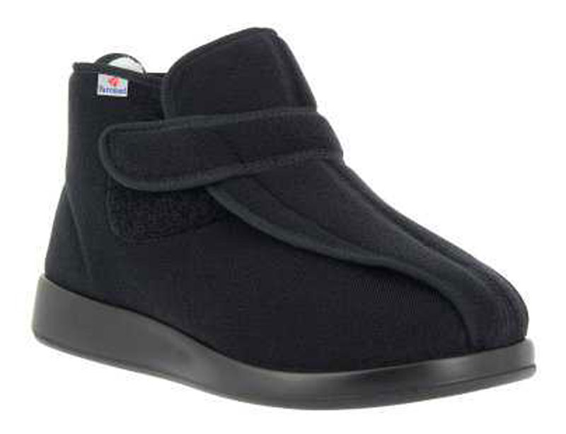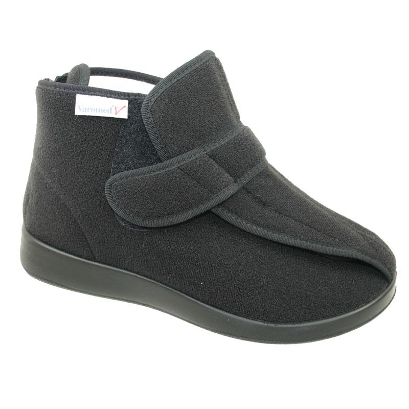 Die Verbandschuhe Varomed Meran schwarz sind weite medizinische Schuhe für Damen und Herren aus dem weichen Obermaterial PA-Velours sind innen mit hygienischem, weichem Frottee gefüttert. Die praktischen Varomed Meran Multifunktionsschuhe für Problemfüße in Weite L sind in alle Richtungen sehr weit zu öffnen. So haben die Verbandschuhe Meran von Varomed als Gesundheitsschuhe für Damen und Herren, auch Trägern mit großer motorischer Einschränkung in den Händen, keine Probleme beim Anziehen.