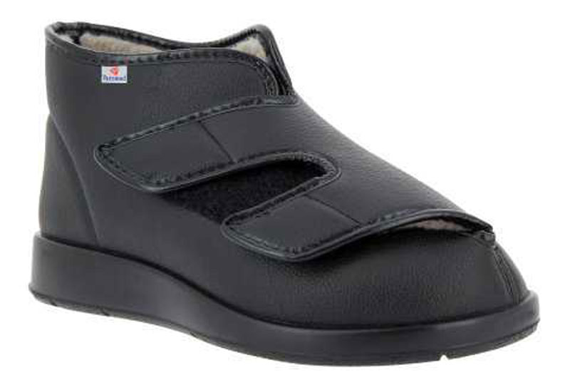Die pflegeleichten Verbandschuhe Varomed London Winter für Damen und Herren aus weichem, schwarzen Kunstlederobermaterial sind mit reinem, mollig warmen und weichen Lammschurwollfutter gefüttert. Diese Gesundheitsschuhe in der Überweite L haben einen weiten Einschlupf im Vorderblatt, sind komplett zu öffnen und bieten geschwollenen oder verbundenen Füßen genügend Platz. Die bequemen Verbandschuhe von Varomed sind ohne störende oder drückende Innennähte gearbeitet. Die breiten Klettverschlüsse der medizinischen Schuhe für Damen und Herren bieten auch motorisch eingeschränkten Personen ein gutes Handling bei An- und Ausziehen der warmen Verbandschuhe.